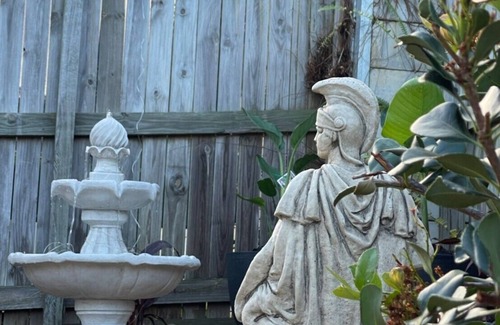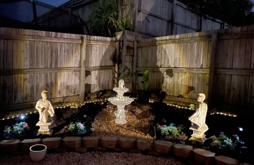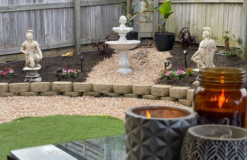 Unique design and romanesque style. Perfect for family gatherings and business trips. Relaxing garden view with a lovely fountain. Picnic in the backyard with BBQ grill. Dining area on the patio. Enjoying your holiday with joy and fun.