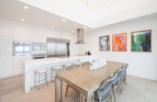 The gourmet kitchen features a suite of Thermador appliances, plus countertop appliances and a kitchen island with breakfast bar seating. Cookware, dishware, glassware, and cutlery also come provided. An outdoor dining table with seating for 6 is furnished on the private balcony for meals with sweeping oceanfront views.
