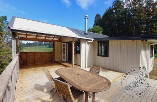 The cottage and deck overlooks a small stream and bush, a small orchard and also has rural views.