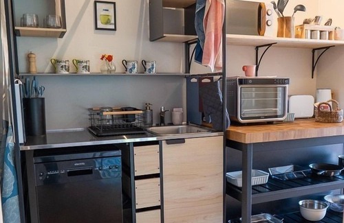 The kitchen has a fridge, an induction hob, an Ninja oven, a kettle, a freezer and a microwave.