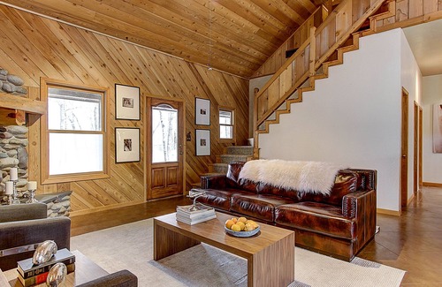 The cabin has a large, open floor plan concept perfect for large groups to gather around the kitchen. Professionally decorated with a modern, hip style.