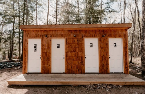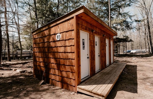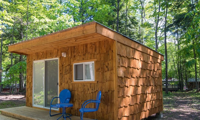 Very unique bungalows located in a campground on lakefront property. Bungalows have a very open floor plan with no rooms or interior walls. You walk in to a queen bed and a set of full size bunk beds. Also included is electricity, a mini fridge and table. Outside the bungalow you will find a fire pit, picnic table and a small charcoal grill. There is no running water in the cabin and the BATHROOMS ARE LOCATED A SHORT DISTANCE AWAY (25 feet) within the campground and include warm showers and flushing toilets. Drinkable water also located at the campground. At just under 200 square feet, bungalows are very cute and cozy. Built in 2020. Perfect way to get away on a budget.