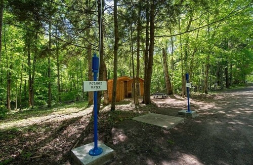 Very unique bungalows located in a campground on lakefront property. Bungalows have a very open floor plan with no rooms or interior walls. You walk in to a queen bed and a set of full size bunk beds. Also included is electricity, a mini fridge and table. Outside the bungalow you will find a fire pit, picnic table and a small charcoal grill. There is no running water in the cabin and the BATHROOMS ARE LOCATED A SHORT DISTANCE AWAY (25 feet) within the campground and include warm showers and flushing toilets. Drinkable water also located at the campground. At just under 200 square feet, bungalows are very cute and cozy. Built in 2020. Perfect way to get away on a budget.