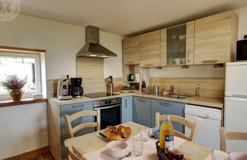 80m² gîte on the ground floor and upper floor: living area with a lounge and a fully equipped and fitted kitchen, a bathroom with a walk-in shower, a toilet, and two bedrooms with four single beds (which can be combined to form a king-size bed). To make your stay even more enjoyable, beds are made upon arrival, and utilities are included in the rental price. Very high-speed internet access is available. The owners, who are committed to the character of this former farm building and are committed to respecting the environment, have restored the bakehouse with taste and passion. You will be charmed by the traditional materials: earth/straw/lime walls, stone walls, exposed beams, etc., combined with careful decoration and a warm atmosphere.