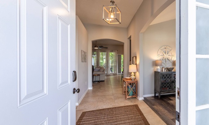 There is a 8' x 20' screened lanai that leads to the backyard that is landscaped with an outdoor fire pit and small grassy area. You will also find a gas grill available for your use.