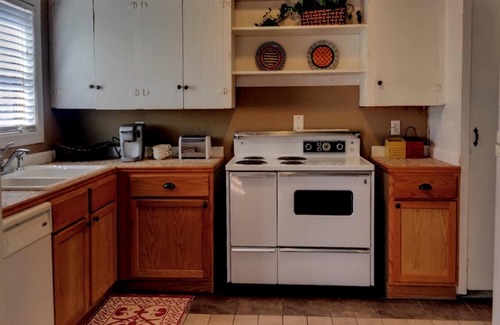 Rustic home in historic neighborhood. Two bedrooms and one bath. Large living area with mock fireplace. Dining area with patio doors overlooking the backyard. Bathroom offers bath tub with shower. One block to Memorial Park and Amarillo College. Centrally located and just a short drive to downtown Amarillo. Come see the Sod Poodles play baseball in the state of the art stadium. 30 minutes to the second largest canyon in the US, Palo Duro Canyon. Take a stroll on Rte. 66 and enjoy the shops and restaurants. Everyone is welcome along with your furry friends.
