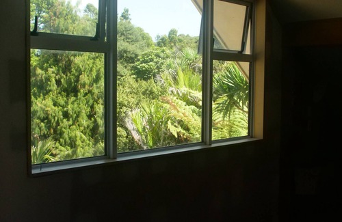 The house is almost complete in its makeover, and has everything you need to enjoy your stay. A downstairs bathroom with a fantastic bath and rain head shower. Kitchen designed and built by our own local craftsman, with a single drawer dishwasher, electric oven and gas hob. The upstairs master bedroom with powder room attached has unobstructed and amazing views over tree covered valleys to the Tasman Sea. The smaller two rooms upstairs presently have 1 x queen size bed each with a single bed and roll out single bed in an open area that can be utilized as an extra sleeping space, a chill-out space for teenagers and device time or perhaps a yoga spot. Downstairs, along with the kitchen, bathroom, lounge and a great dining room looking out to the Karekare Valley and Tasman Sea, is also another double bedroom containing 1 x queen size bed: again, having amazing sea and bush views. Lounge and dining room both open out through bi-folding doors onto the main sea and bush view deck, creating a large entertaining / get together space. Lounge has a fireplace (hopefully not needed in summer) with views to bush and sea from one side, and the main parking area and gardens from the other. The front lawn brings to mind outdoor games such as boules (without the shells or sand in this case), lazing around with a glass of wine or juice and has a lovely old apple tree which is a perfect place to throw a rug down and lay in the shade. We look forward to sharing a special slice of our paradise with you.