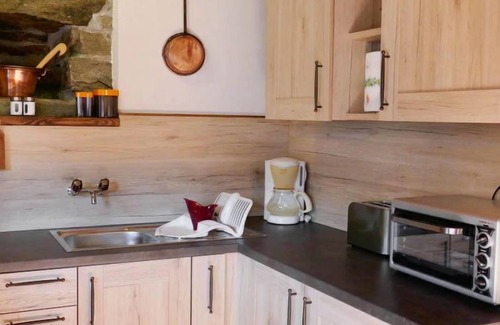 "Rustico Fey", 2-room cottage 50 m2 on 2 levels, south facing position. Comfortable and cosy furnishings: open living/dining room with open-hearth fireplace, dining table and TV (flat screen), radio. 1 room with 2 beds (90 cm, length 200 cm). Open kitchen (mini-oven, Gas stove, 3 gas rings, toaster, electric coffee machine) with bar and wood-burning stove. Exit to the patio. On the lower ground floor: (steep stair). Shower/WC. Terrace furniture, barbecue (portable), deck chairs (2). Marvellous panoramic view of the mountains, the valley and the countryside. Facilities: children's high chair, baby cot for up to 2 year olds (extra), hair dryer. Please note: non-smoking house. Maximum 1 small pet/ dog allowed. Fire extinguisher. NL-00003747