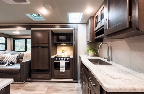 Welcome to Glamping RV 3, where luxury meets nature in the exquisite Grand Designs Transcends 297QB. Nestled against the backdrop of a lush forest with enchanting lake views, our 36-foot Bunkhouse RV redefines the art of outdoor living.