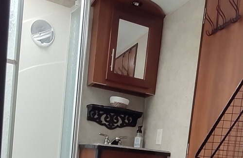 40 foot toy hauler, 2 bedrooms Queen bed in master room, bunk beds in lower room, there is a loft that can sleep 2. Recliners lay out to a bed. Sleeps 8 comfortably. Gas/ Charcoal with oven pit. Firepit with seating area. Has outdoor dinning area on the deck with a bar and outdoor refrigerator. Minutes from Marble Falls and Lake Travis.