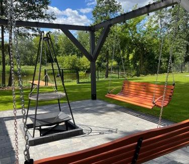 Offering garden views, Rzecznicy Relaksu in Długosiodło features accommodations and a garden. With river views, this accommodation provides a terrace. The vacation home offers rooms with air conditioning, free private parking, and free Wifi. All units comprise a seating area with a sofa, a dining area, and a fully equipped kitchen with various cooking facilities, including a dishwasher, an oven, a microwave, and a toaster. There's a private bathroom with shower in every unit, along with bathrobes, slippers, and a hair dryer. At the vacation home, units are equipped with bed linen and towels. Guests can relax near the outdoor fireplace at the vacation home. Warsaw Modlin Airport is 59 miles from the property.