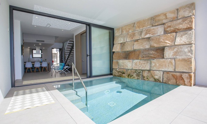 This is the best option if you want to stay near the beach and at the same time enjoy all modern comforts including a private pool with integrated jacuzzi, which is also acclimatised, and where you will be able to relax and disconnect during your vacation. This is a chlorine pool sizing 3x3 metres and with a depth between 1.4 and 1.5 metres which is placed on the ground floor terrace of the house. You will also find comfortable sofas and armchairs at the terrace, in order to rest having a drink before going out. It also offers an exterior shower to wash off the sand and the salt after a long day at the beach. This accommodation is a village house with attached and nearby neighbours.