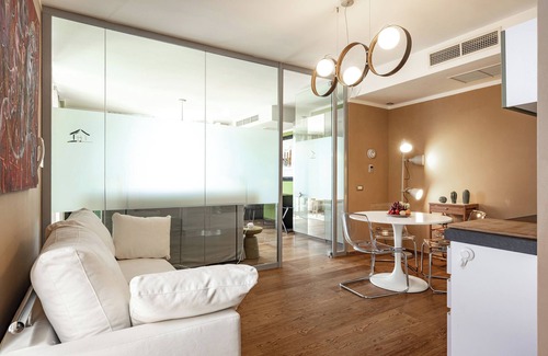 The name B. apartments indicates a line of small "support" apartments for the use of the city, for business, for tourism, for health and any other activity that requires an extended stay in a non-hotel context.
