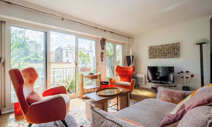A cosy colour palette of oranges and reds evoking the sunset; a distinct jungle theme emerging in the eclectic décor; warm light flooding each space through ample full-height windows. These are the remarkable hallmarks of this two-bedroom home in the La Muette neighbourhood of the fabulous 16th arrondissement, where you’re only moments from the Trocadéro, the flowing Seine and the Eiffel Tower beyond.