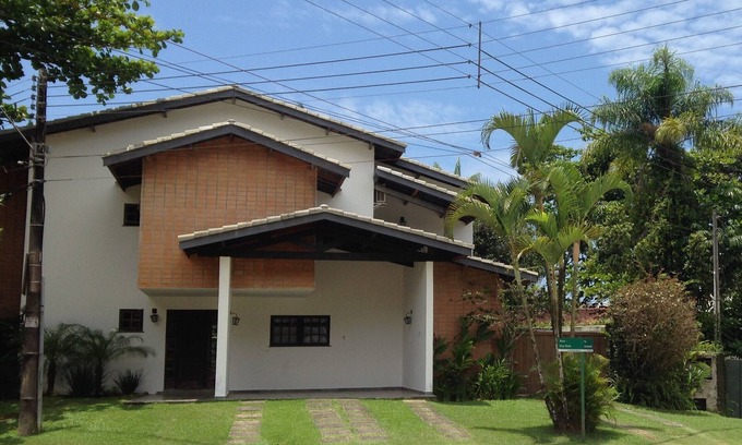 Super cool and airy house, pristine beach with lush view! In the condominium Salga, with motorized security 24h, 50m from the beach. Fully furnished, including kitchen accessories + freezer + pantry; dining room with ceiling fan; covered barbecue, with sink, tables and chairs support; balconies in front, and bottom; total of 4 suites, 3 with balcony - 2 with double bed, 2 with 3 bunk beds - sleeps 16 people; closet, all suites equipped with air conditioning; bathroom service; laundry with washing and drying machines, external clothesline; outdoor pool + indoor pool + outdoor shower; living room with ceiling fan, Sky TV, toilet. It has artesian well - without danger of lack of water! Located approximately 25km from the center of Ubatuba and Caraguatatuba. Do not cross lane to go to the beach; markets, restaurants, shopping nearby; quiet place to be with family, children, tranquil sea, beautiful landscape!