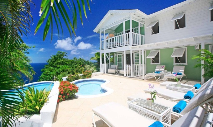 Each of the 3 air-conditioned bedrooms (two seaside) has an ensuite bathroom and walk-in closet. The lower seaside suite has direct pool access via a furnished covered porch. The upper seaside suite has a furnished private balcony. Adjoining the seaside suites is the double-deck gazebo with private seating and 180⁰ views. A well-equipped eat-in kitchen on the upper-level frames sparkling seascapes through the large, custom-designed windows. Saline Reef Villa is minutes from two 18-hole golf courses (Cabot and Sandals), beaches, a full-service marina, shopping, dining and activities in Rodney Bay.