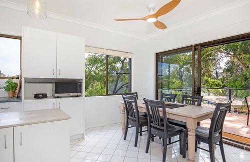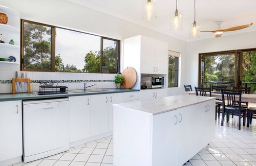 Return to rinse off the sand in the outdoor shower, and enjoy lunch cooked in the beautiful modern kitchen or out on the BBQ, and eat at the balcony dining table surrounded by lush greenery and sunshine. During downtime, battle over a board game at the table, or spread out; two living areas mean that the adults can enjoy some quiet in the gorgeous upstairs living room with combustion fire and comfortable couches, and the kids can watch cartoons downstairs. Steal some privacy with a cuppa and a book in the small sitting room, with enormous windows to let the light in.