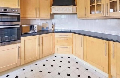 The kitchen is a spacious room with light wooden cabinets and black granite worktops. Spotted tiles add to the charm. You’ll have everything you need for your stay as the kitchen is equipped with a dishwasher, fridge, freezer, kettle, microwave, oven, hob, toaster and washing machine.