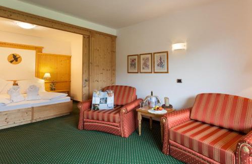 The 4-star Saltria - your Alpine experience provides comfort and relax thanks to its well-equipped wellness center with sauna, hot tub, Turkish bath and indoor pool. It is located at the foot of the Seizer Alm. At the on-site restaurant you can enjoy a morning buffet also including savory products, such as cold cuts, cheese and eggs. For lunch and dinner, local dishes and international cuisine are served. The property is around 656 feet from the Florian ski elevator and the Floralpina slopes on the Seizer Alm. The towns of Siusi and Castelrotto are both a 30-minute drive away. Your room at the Saltria is fitted with light-wood furnishings and carpeted floors. Facilities include an LCD satellite TV and a private bathroom complete with bathrobes. Each room features a mountain-view window or balcony.