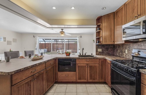 Fully Equipped Gourmet Kitchen: Cook with ease in a stunning kitchen featuring granite countertops, wood cabinets, stainless steel appliances, and a gas stove, all centered around a sprawling breakfast bar that's as beautiful as it is functional.