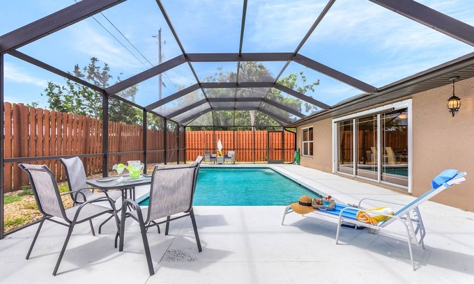 Saltwater Pool with Pool Cage: Dive into the refreshing saltwater pool, surrounded by a protective pool cage, offering a private oasis for swimming, lounging, or soaking up the Florida sun in complete comfort.