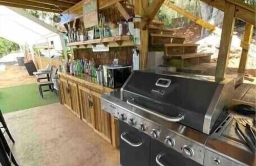 Our rentals are nestled within a large home with a tropical themed back yard and plenty of lounging areas to relax. We have 5 large decks, Saltwater Pool, floaties, an outdoor Kitchen and BBQ Grills, Honor Bar, outdoor dining areas, Lounge chairs, Hammocks, Corn Hole and other bar games.