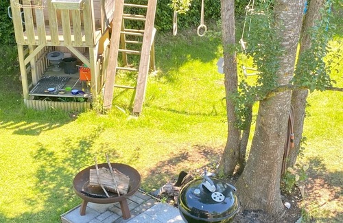 "On top" you will find a spacious living-dining room with a cozy old wood seating area for up to 8 people, a cozy sofa corner with a fireplace and access to the arbor, garden and balcony. The kitchen is fully equipped. You will find ceramic hob, oven, fridge-freezer, dishwasher and built-in coffee machine as well as sufficient dishes, cutlery and glasses. Another bedroom with a double bed and 1 children's room with a bunk bed complete the accommodation for 6 people. A folding bed can also be provided on request. The bathroom has a shower and whirlpool tub and a washing machine. The toilet is separate.