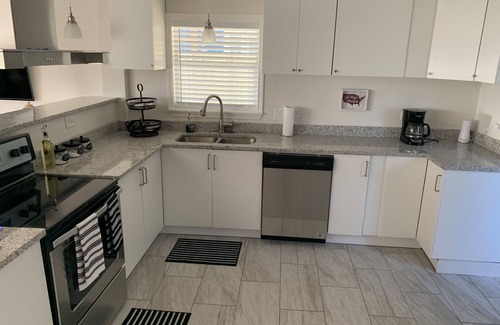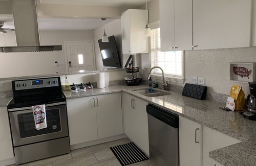 One-story, modern kitchen, home cooked meals. Full-size appliances. Note washer equipped with high tech eco-friendly ozone system - safer and cleaner, fragrance free, no detergent required.