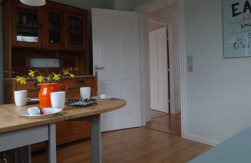 The Uferschwalbe apartment is a new apartment on the 1st Floor of a single-family house, which impresses with its Nordic airy and bright ambience. From the really pretty eat-in kitchen you have a beautiful view of hilly meadows and from the balcony in the living room you can see the loop if the trees do not have any leaves. This beautiful fjord is only 150 m away and a bathing and walking paradise for you and your dog, which you can bring on request. With the bike you are in 10-15 minutes in the beautiful Schleistadt Kappeln and in half an hour on the Baltic Sea. A small, cozy corner in the garden, surrounded by wild roses, invites you to grill or relax. You can expect an accommodation in which you will feel at home.