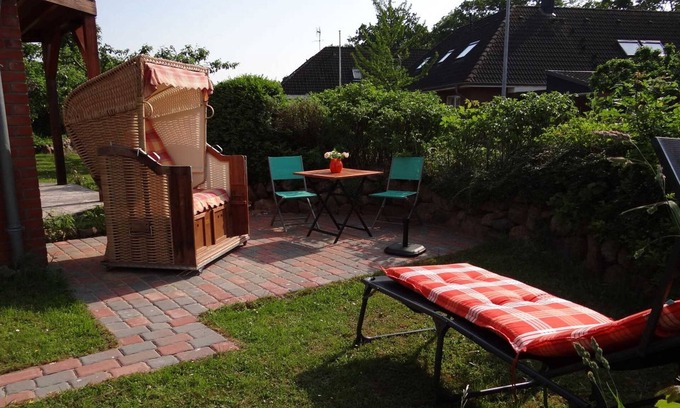 The living room is furnished with two comfortable reading armchairs and a sofa bed. The flat screen TV has satellite reception and you can also have breakfast on the balcony with a view of the loop (if the trees do not have any leaves). The bedroom has a 180cm wide double bed. There are large built-in cupboards both there and in the living room. Reading lamps and blackout curtains are included. There are dishes and accessories for 2 people. The dishwasher makes washing up easier and everything can be prepared on the stove with an oven. Toaster, coffee maker and kettle are standard. The bathroom is large and spacious with a shower cubicle and bathtub (for an additional charge). Towel warmers and underfloor heating ensure even more well-being .. The washing machine is also located here. In addition, you will find the following in the apartment: Internet access via free WiFi, ironing board and iron, clothes horse, basic equipment (detergent, rag, sponge, dish towel, dishwasher tabs, kitchen roll and toilet paper), first-aid kit and alarm clock. In the garden there is a separate seating area for you with a beach chair and grill. Bicycles can be parked in the open carport.