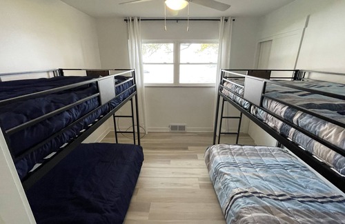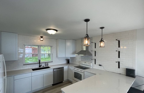 3 bedroom 2 bathroom waterfront house on Sand Point. It’s located on the south shore toward the end of the peninsula. House has a large 1.5 acre wooded lot and has a very long driveway from the road. The house does have many neighbors and a vibrant shoreline. Plenty of parking with a large parking area. Nice yard and shade trees with a nice gentle slope to the sandy beach (no big sea wall here!) Brand new memory foam mattresses are very comfortable. Also a new interior throughout. Central air if needed. Feel free to bring your pets along, as long as they stay contained in the yard,(for an additional fee). Very nice hard sandy lake bottom is wonderful for kids and if you want to park a lawn chair in or near the water. Feel free to bring your boat along and anchor it out front.
