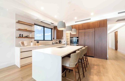 This oceanfront jewel offers six spacious 4-bedroom residences with dazzling ocean views. A deep list of unique amenities includes a rooftop terrace with a fitness center, shared pool, and dedicated yoga space. A private gated sundeck includes beachfront loungers and umbrellas. A nearby staircase leads down to the barefoot sandy beach.