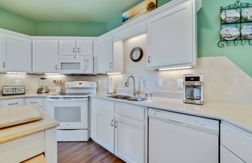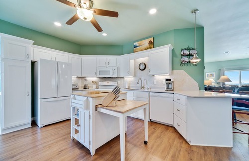 For your dining pleasure there is a large table with six chairs, plus two bar stools. The kitchen always gets rave reviews from our guests! It has everything you need to prepare and serve a meal. There are plenty of excellent restaurants in the area, but if you prefer to stay in and cook your own meals, you won't find anything lacking in the kitchen at Sandy Bottoms. Just read the reviews!