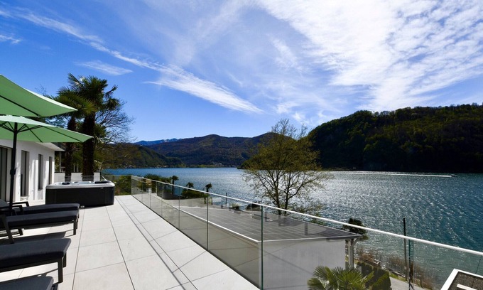 Fabulous lakeside villa newly built with hot tub, huge terrace and spectacular lake views! South facing sunny property, 170 m2 terrace , barbecue area, private parking, air-conditioning and hot tub available all year round. Come and enjoy Sans Souci 1, situated just a few meters away from lake Lugano. You will be staying within 1.5 hours drive from Milan and within 1 hour from the heart of the Swiss Alps. At Sans Souci 1 you can truly take in the view, relax and experience Switzerland in all its beauty!