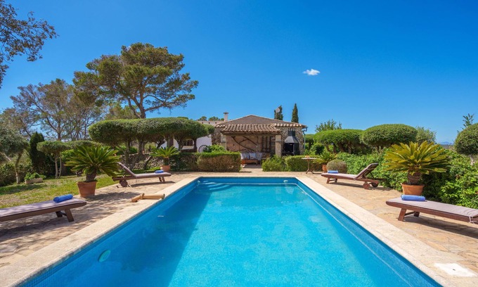 Sant Joan: Very beautiful, rustic farm estate "Sant Joan", surrounded by trees. Outside the resort, in a quiet, elevated position, 22 km from the sea. Private: garden with lawn and wildlife garden, swimming pool angular (10 x 5 m, seasonal availability: 01.Jan. - 31.Dec.). Patio, arbour, pergola, garden furniture, barbecue. In the house: internet access, WiFi, storage room for bicycles. 30 m long steep motor access to 40 m from the house. Parking at the house on the premises. Shop 1.8 km, grocery 1.8 km, supermarket 1.8 km, restaurant 1.8 km, bar 1.8 km, bakery 1.8 km, pub garden 1.8 km, 20 minute walk to the centre, bus stop 2 km, sandy beach "Can Picafort, Es trenc" 22 km, rocky beach "Can Picafort" 22 km. Sports harbour 22 km, marina 22 km, golf course (18 hole) 20 km, tennis 3 km, sports centre 3 km. Please note: car recommended. Suitable for families, suitable for seniors. Object suitable for 4 adults groups of teenagers on request only. Loading and unloading of baggage is possible at the holiday house. Airfield 37 km from the property. This house works with solar power.