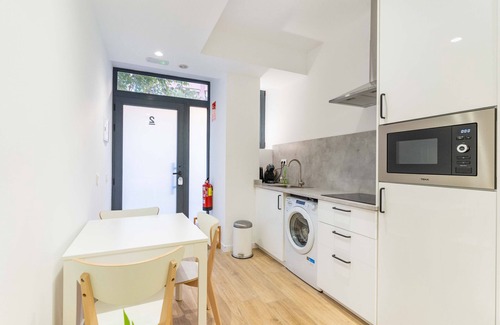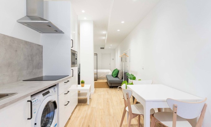 This modern studio in Valencia is ideal for accommodating 2 adults and 2 children, or up to 3 adults. The layout is flexible: it can host 2 adults in the bed and 2 children on the sofa bed, or 2 adults in the bed and 1 adult on the sofa.Fully equipped, the space includes air conditioning and central heating for comfort in any season. Additionally, it features Wi-Fi, a TV, washing machine, and hair dryer, covering all your needs.The open-plan ceramic cooktop kitchen comes with a refrigerator, microwave, coffee maker, and essential utensils, perfect for meal prep during your stay.Located in a lively and accessible area, this studio is perfect for those looking to explore Valencia with all comforts at hand. We look forward to welcoming you soon!