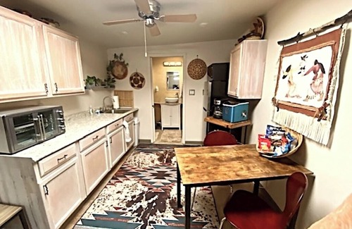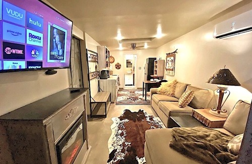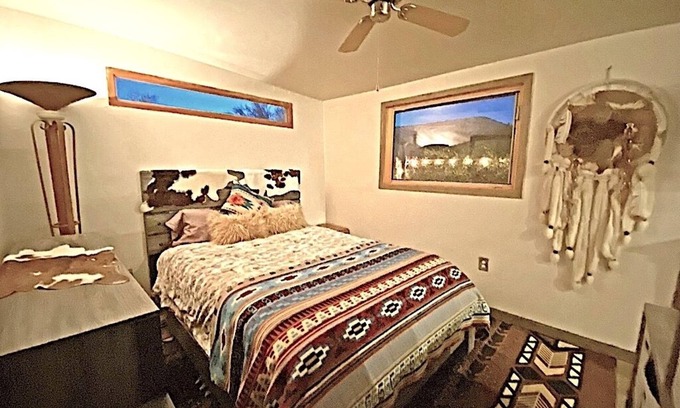 Quaint Private Studio tucked away at Mystic Ranch just steps from parking. Gated entrance to private grassed garden with barbeque, patio table & sunbrellas. Comfortable new queen bed, dressor, hanging and cubical storage. Cozy fireplace, with swivel wall TV featuring Roku, Hulu, Netflex and Youtube TV paid channels. Comfortable sofa - chaise with ottoman and side table. Kitchenette incudes microwave, Oster oven with airfryer, refrigerator, ice machine, coffee pot, and some countertop cooking. Nice walk-in shower, bathroom storage and medicine cabinet. This is a very fun "tiny house" layout with very flavorful Southwest style decorations. Property also has a swimming pool, Jacuzzi, and Day Spa with Massage & Facials by appointment.
