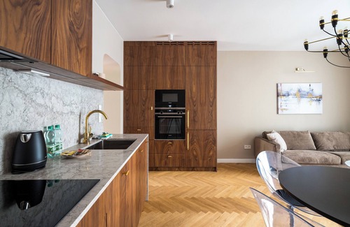 Saska Kępa Deluxe Apartment is a warmly and stylishly decorated apartment featuring a living room with a lounge area and kitchenette, two separate bedrooms, a bathroom, and a balcony where guests can relax and enjoy a morning coffee or an evening glass of wine. Guests have access to various amenities, including free WiFi, cable TV, a washing machine, a tumble dryer, an iron, a hairdryer, a dishwasher, an oven, a refrigerator with a freezer, an induction stove, a kettle, a Nespresso coffee machine, a microwave, and kitchen accessories. The apartment also includes an outdoor parking space.