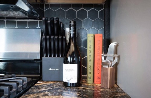 The kitchen is well stocked for making some delicious meals (or just coffee!) during your stay. There’s plenty of counter space, and the cabinets and drawers are labeled to help you easily find what you are looking for. The dining area features a polished natural stone center island with seating for four, and a butcher block extension for extra table or prep space.