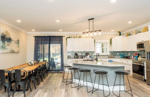 ‣ Wooden table seats 14 • Kitchen island seats 5