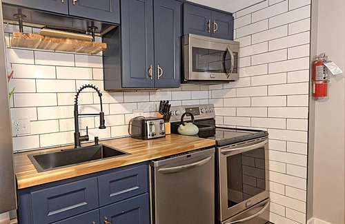 Take a nostalgic trip down memory lane! Enjoy preparing and eating your meals in the sleek and modern kitchen with butcher block countertops. This kitchen will leave you wanting for nothing.