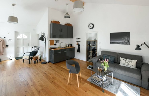 Modern studio in a Swedish house with high quality furnishings in a loft style. The apartment has a separate entrance and a small terrace. There is a large living room (40sqm) with a comfortable sofa bed (160cm wide), a kitchenette and a separate bathroom with a waterfall shower. Towels, bedding and free WiFi are a matter of course for us! The BOJE16 is located in a quiet residential area in Hamburg-Bergedorf: by bus and S-Bahn you can be at the HBF Hamburg in 25 minutes. Bus stop right outside the front door. Street parking is available. The apartment is furnished to a high standard. Nespresso machine, milk frother, refrigerator, induction hob, microwave with oven, kettle, grill, TV, high-speed internet, etc.