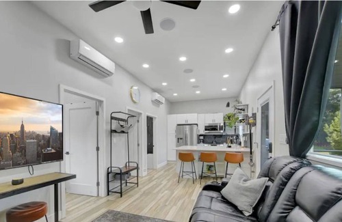 This house is a newly constructed flat with all modern finishes. Our clutter free space encourages clean, peaceful relaxation. Everything you need for a peaceful nights rest away from home is readily available to you. Memory foam mattresses, hotel quality linens and fluffy pillows await. Each bedroom, as well as the living room and patio come equipped with brand new LG 4K HD smart TVs. The bunk room features 2 queen sized beds and a rock climbing wall. There is a whole house audio system to enjoy as well as an Amazon Alexa Show that is connected to smart lighting for every room inside and outside of the house. While the indoor living space is akin to the size of a 2 bedroom luxury suite, it's the outdoor space that really sets this place apart. The front patio has a welcoming vibe with a full set of dining furniture, propane barbecue, and overlooks the fire pit seating area, great for nighttime fireside conversation. Communal areas on the property include a wonderful area for children to play, large yard, swing set and slide, and the most popular attraction, the zip line!