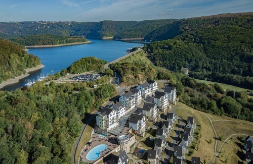 Modern Comfort and Relaxation This spacious maisonette at the Eifeler Tor Resort offers the perfect blend of style and comfort. Spread across two floors, it features a bright living space with a cozy seating and dining area, ideal for unwinding after a day of exploration. The open kitchen makes home dining easy, while the private sauna adds a touch of luxury. Step outside to your furnished terrace and enjoy peaceful views of the surrounding landscape. Guests also have access to the resort’s shared indoor and outdoor swimming pools, play equipment for kids, and a welcoming bar. Discover Nature and Culture The property’s location in Heimbach places you right at the gateway of the Eifel National Park, known for its scenic hiking trails, cycling paths, and lakeside activities at Rursee. History lovers can explore the striking Heimbach Castle and Mariawald Abbey, while families can enjoy boat rides or wildlife spotting in the park. The area is also great for pet walks, offering wide trails and open spaces where your four-legged friends can roam freely. Taste Local Flavors When it comes to dining, you’ll find a mix of hearty German and international cuisines nearby. Enjoy authentic dishes at Restaurant Klostermühle Heimbach or traditional specialties at Zur Krone, both highly rated by locals and travelers. Lakeside dining at Restaurant Café am Seehof offers stunning views with regional favorites, while cozy cafés nearby are perfect for a sweet treat after a long hike.
