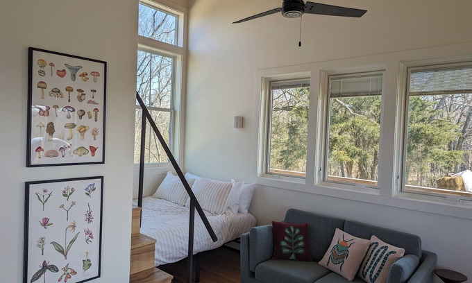 Our cozy cabin features a thoughtful layout that maximizes utility and style in a small footprint. The cabin features two queen-sized beds, one in the main living area that's fully accessible as well as one in a unique, open loft.