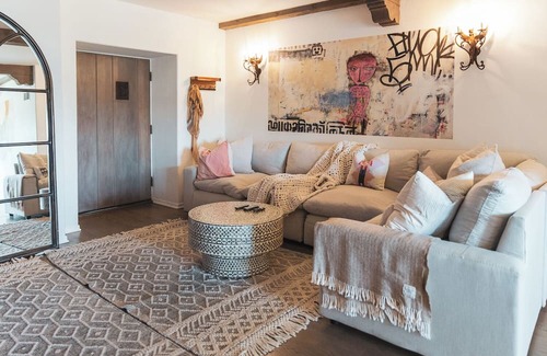 Inside, the villa boasts a stunning interior with gothic sconces, chandeliers, distressed pine beams, and contemporary décor. The gourmet kitchen is fully equipped with high-end appliances, including a Viking stove and a Sub-Zero fridge, making it ideal for preparing delicious meals.