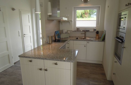 Our Sonnenuferhaus has been new since 2012. In a particularly quiet location in the rear bank area, you will find a clear, Nordic interior in the colors of the coastal landscape. Special furnishing details here are a high-quality designer kitchen and, in addition to the two double rooms, a single room with a raised bed and a small secretary for the laptop or the holiday mail.