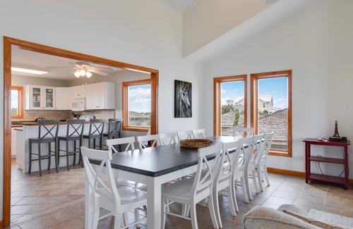 This beautiful home offers large areas to gather together with two living areas on the top-level and a well-equipped kitchen where you can whip up your favorite crab cake recipes and so much more! Enjoy the ocean views from the sun decks, relax on pristine beaches and enjoy quick access to search for the wild horses that roam Carova's four-wheel-drive beaches.