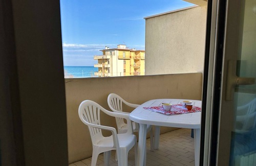 Description: second floor with lift. Living room with dining table, kitchenette and double sofa bed - bedroom with double bed - bathroom with shower - small terrace with sea view equipped with table and chairs. Air conditioning. Washing machine.