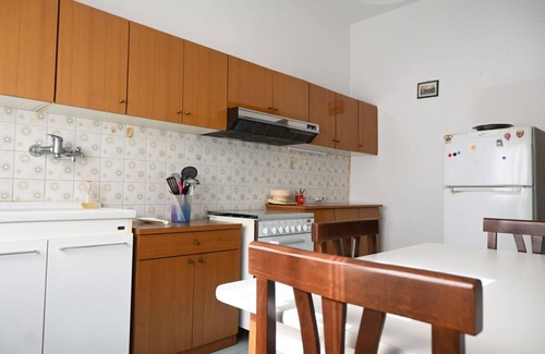 Description: first floor of a building. Living room with double sofa bed and TV - separate kitchen with dining table - master bedroom with double bed and private balcony - second bedroom with two single beds and private balcony - full bathroom with shower and washing machine.